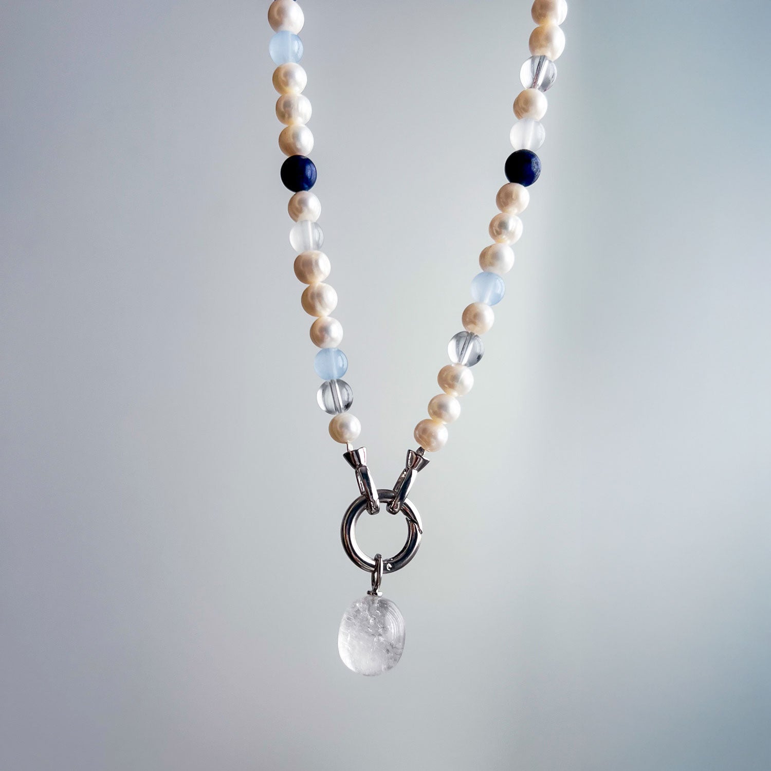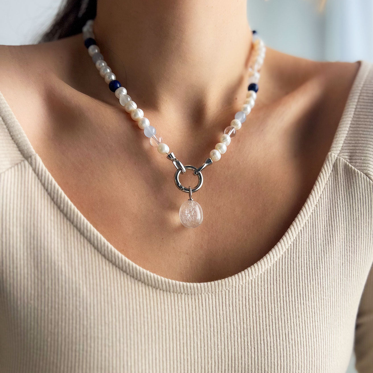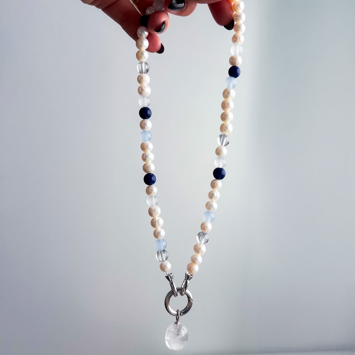 שרשרת בעבודת יד המשלבת פנינים טבעיות עם אבני אגט ו־קריסטל קוורץ, ליצירת מראה נקי, הרמוני ואלגנטי. שילוב האבנים מעניק לשרשרת עומק ותחושת איזון, עם נוכחות עדינה אך מורגשת.