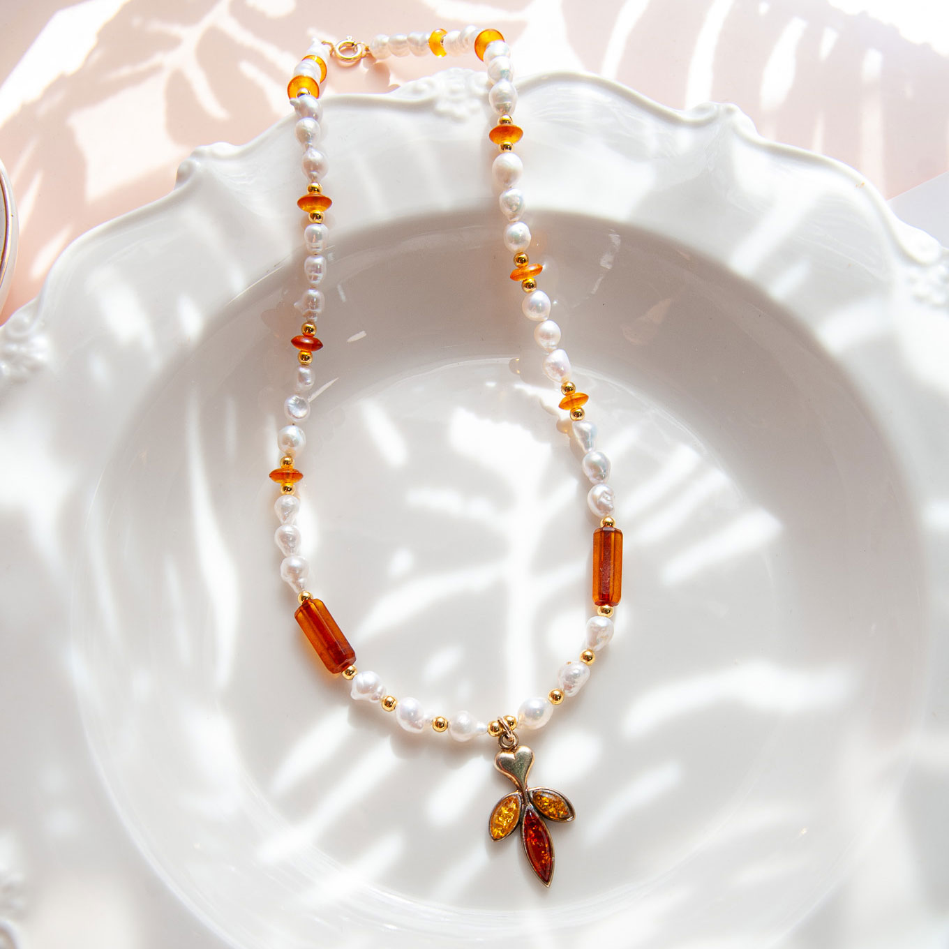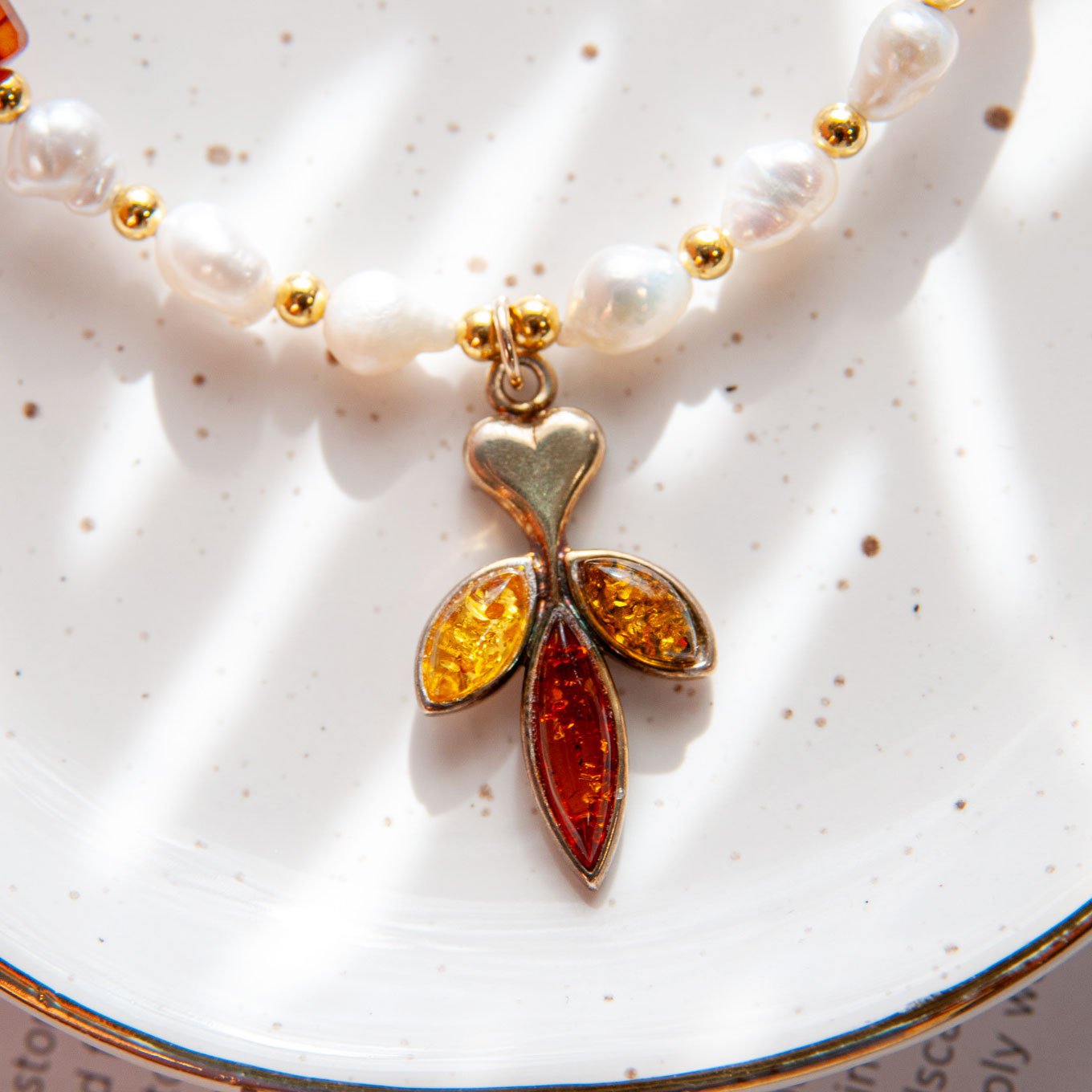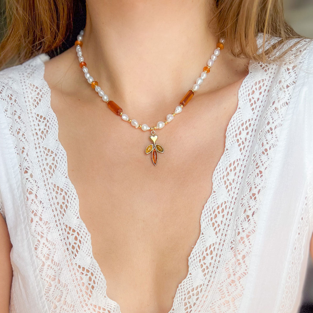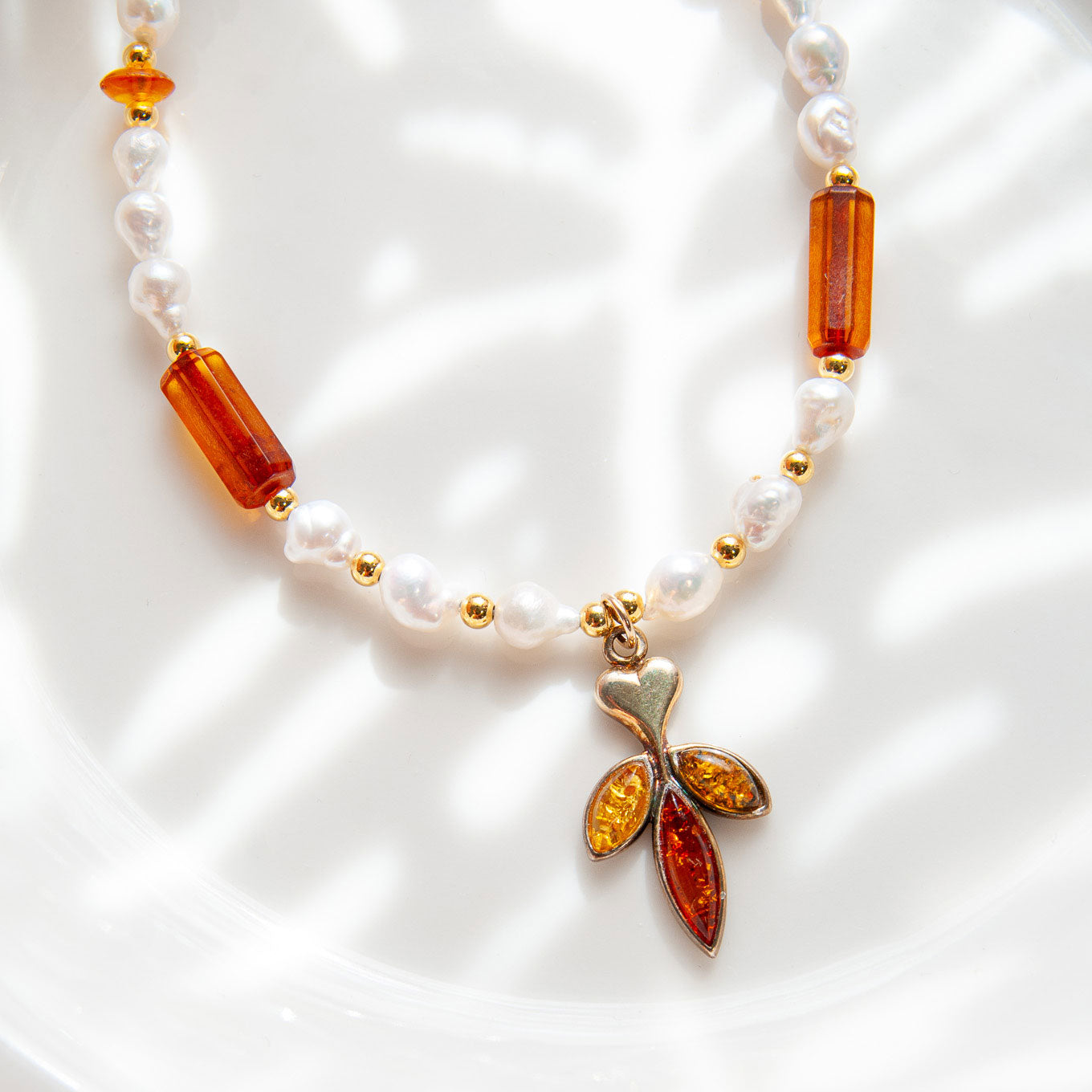 שרשרת פנינים עם תליון ענבר ב3 צבעים