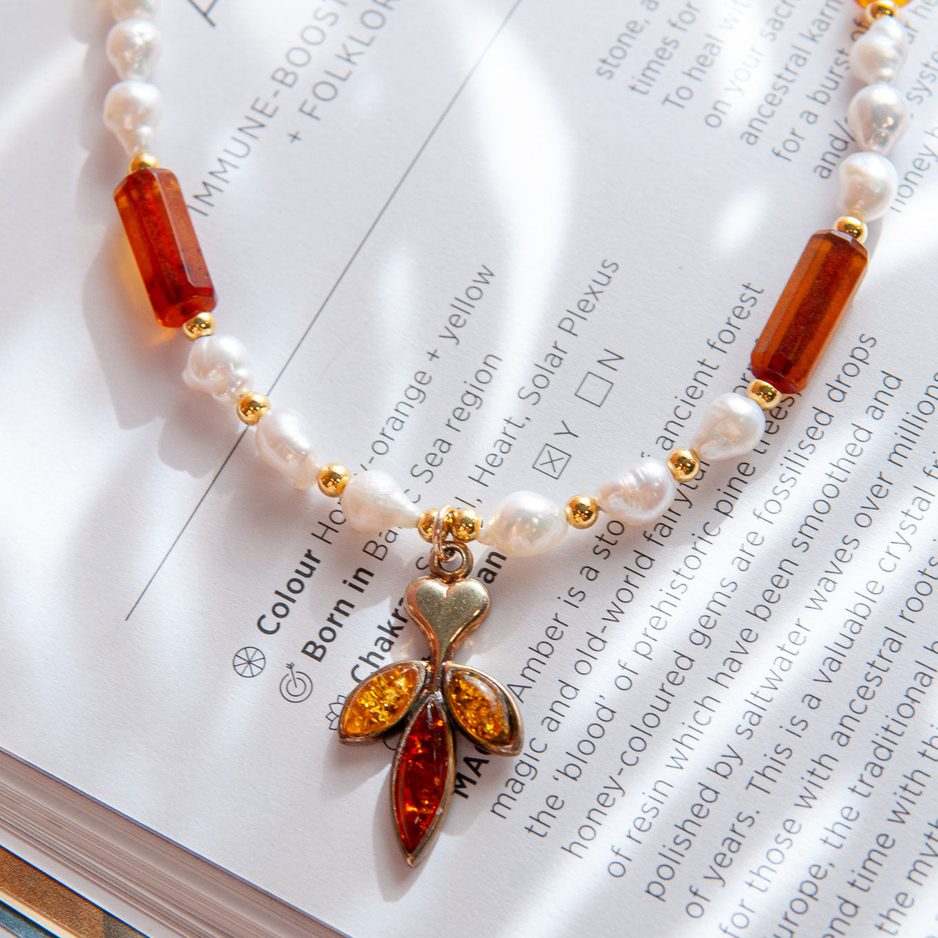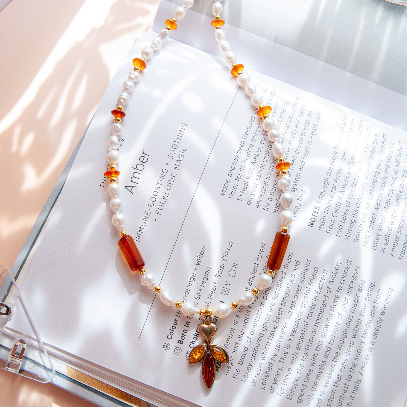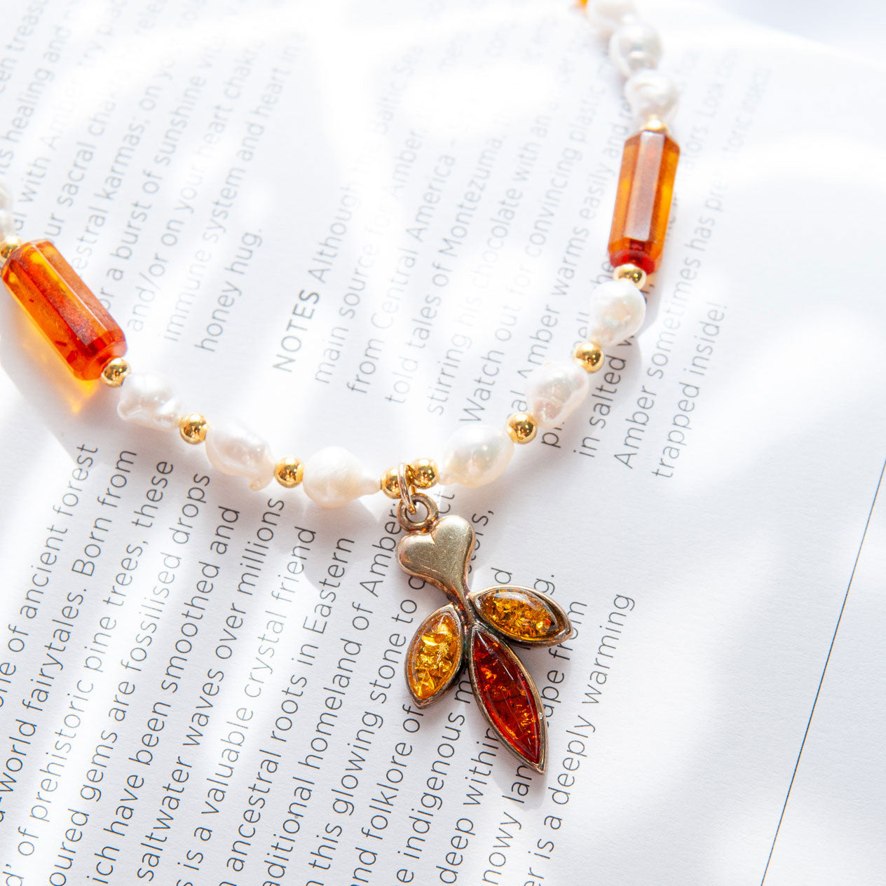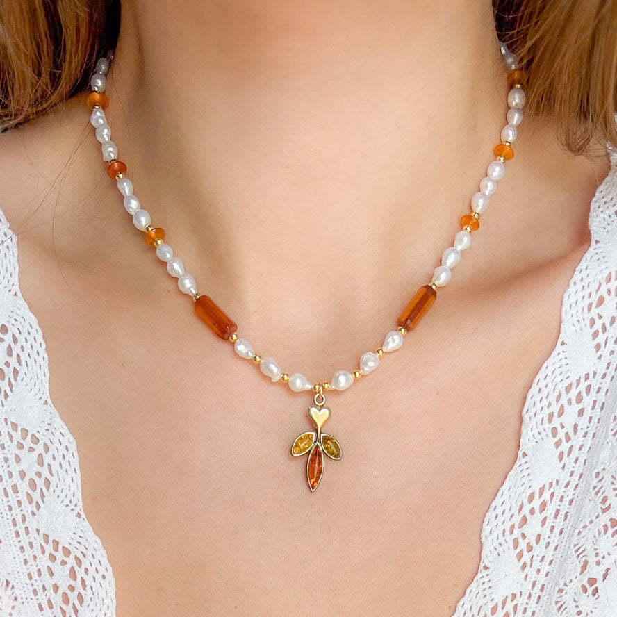 שרשרת פנינים עם תליון ענבר ב3 צבעים