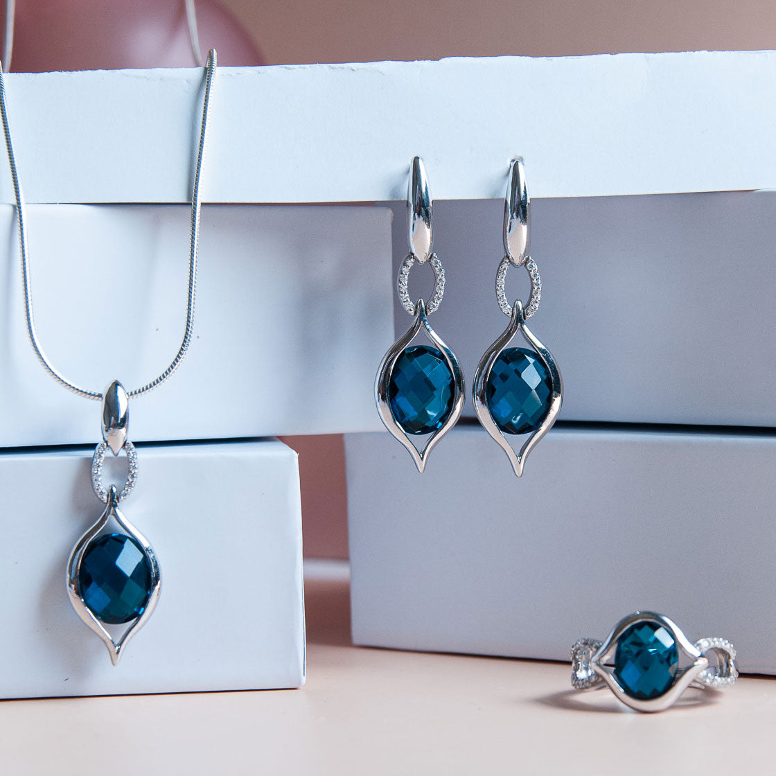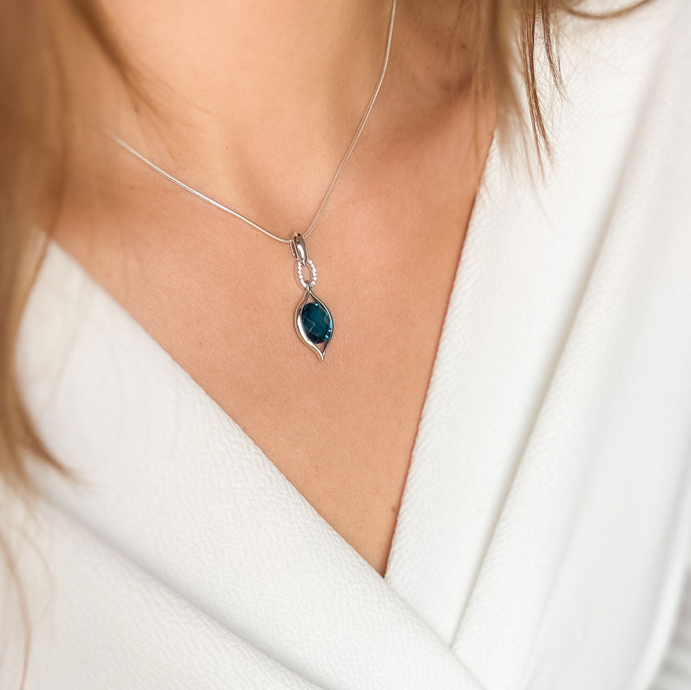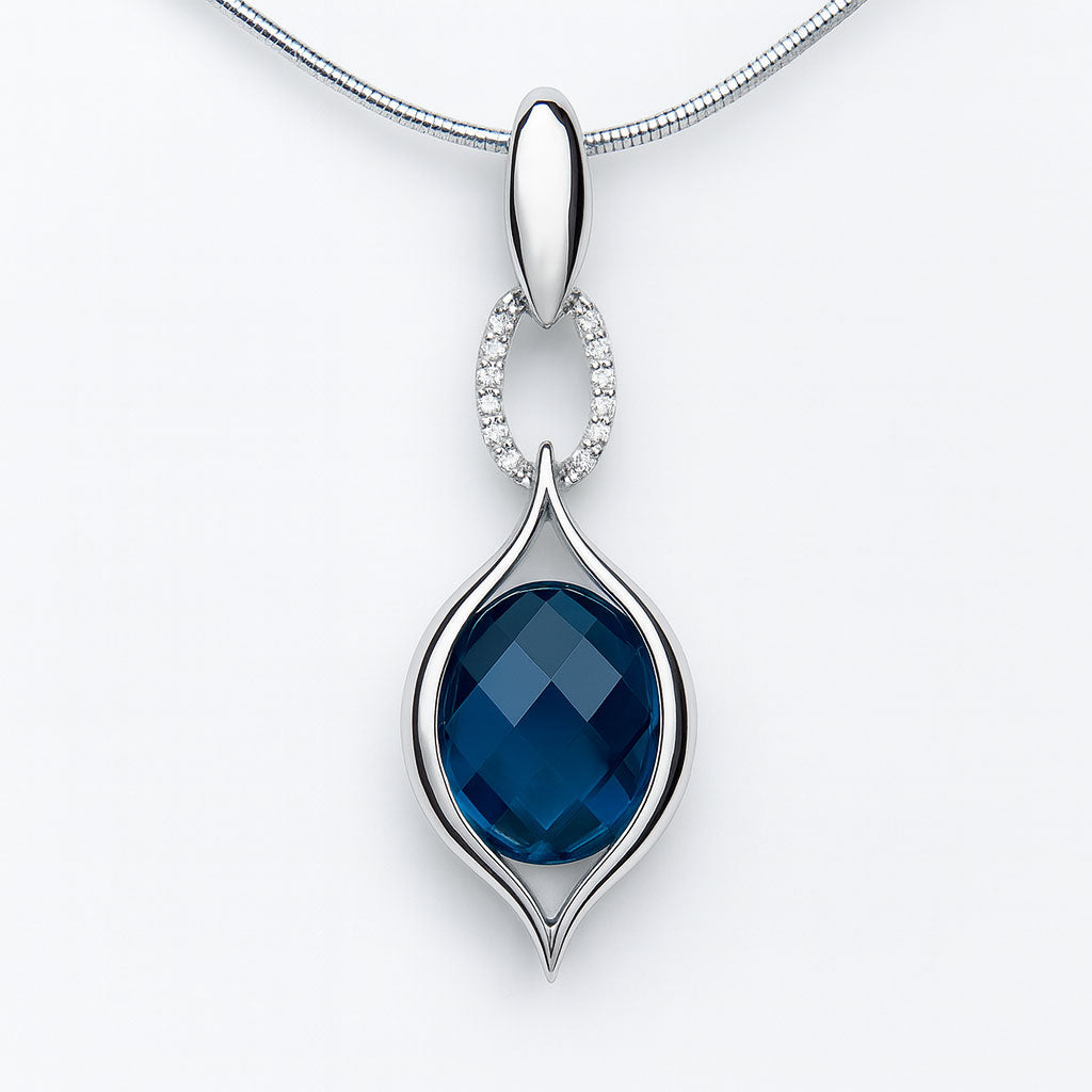 במרכזו אבן Natural London Quartz (Duplex) בצבע כחול-עמוק ומרשים, משובצת לצד אבני זירקון מנצנצות המוסיפות יוקרה ועדינות.