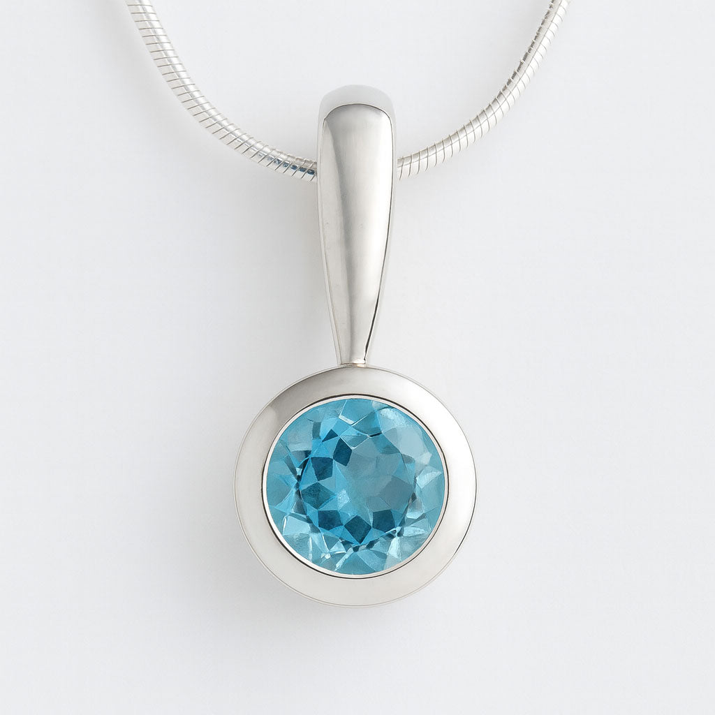 במרכזו משובצת אבן בלו טופז טבעית בגוון תכלת שמיימי (Sky Blue Topaz) – אבן שמביאה איתה שקט פנימי, בהירות מחשבתית ואיזון רגשי.