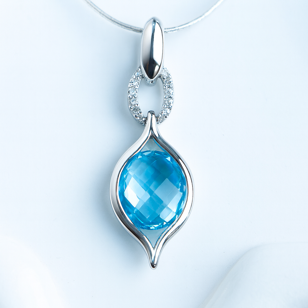 התליון משובץ באבן בלו טופז טבעית בעלת גוון כחול מרהיב, ובאבני זרקון נוצצות המוסיפות ברק וזוהר עדין.