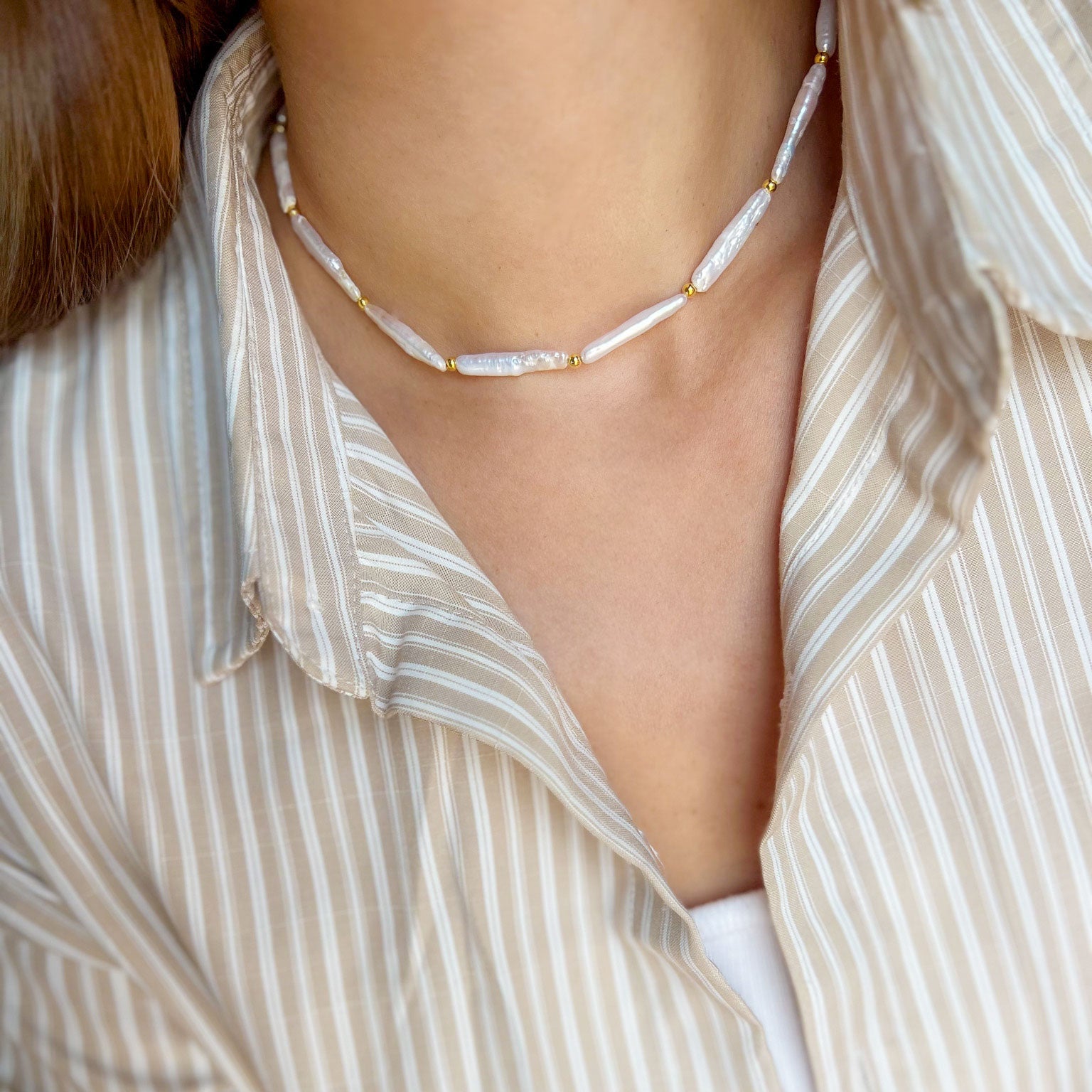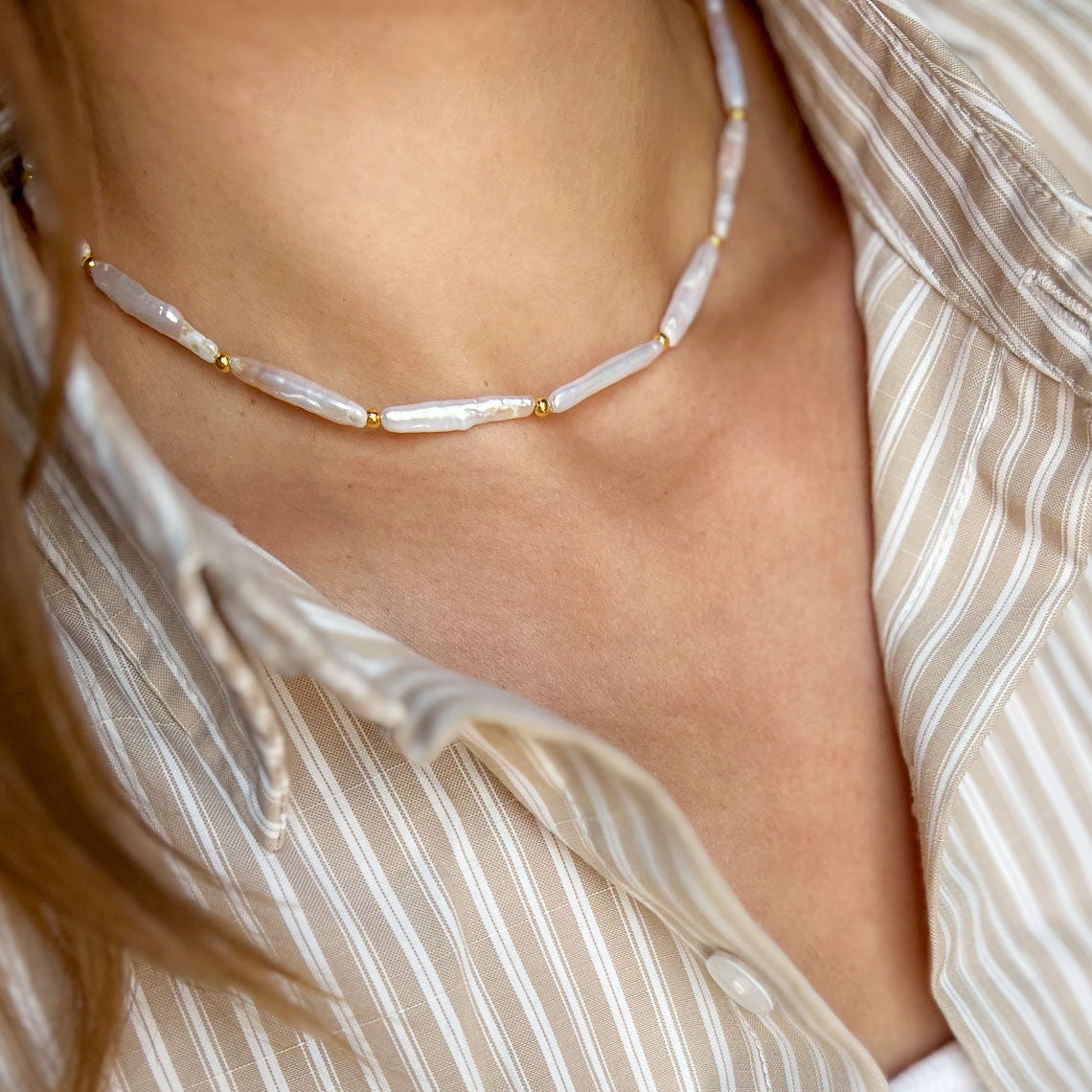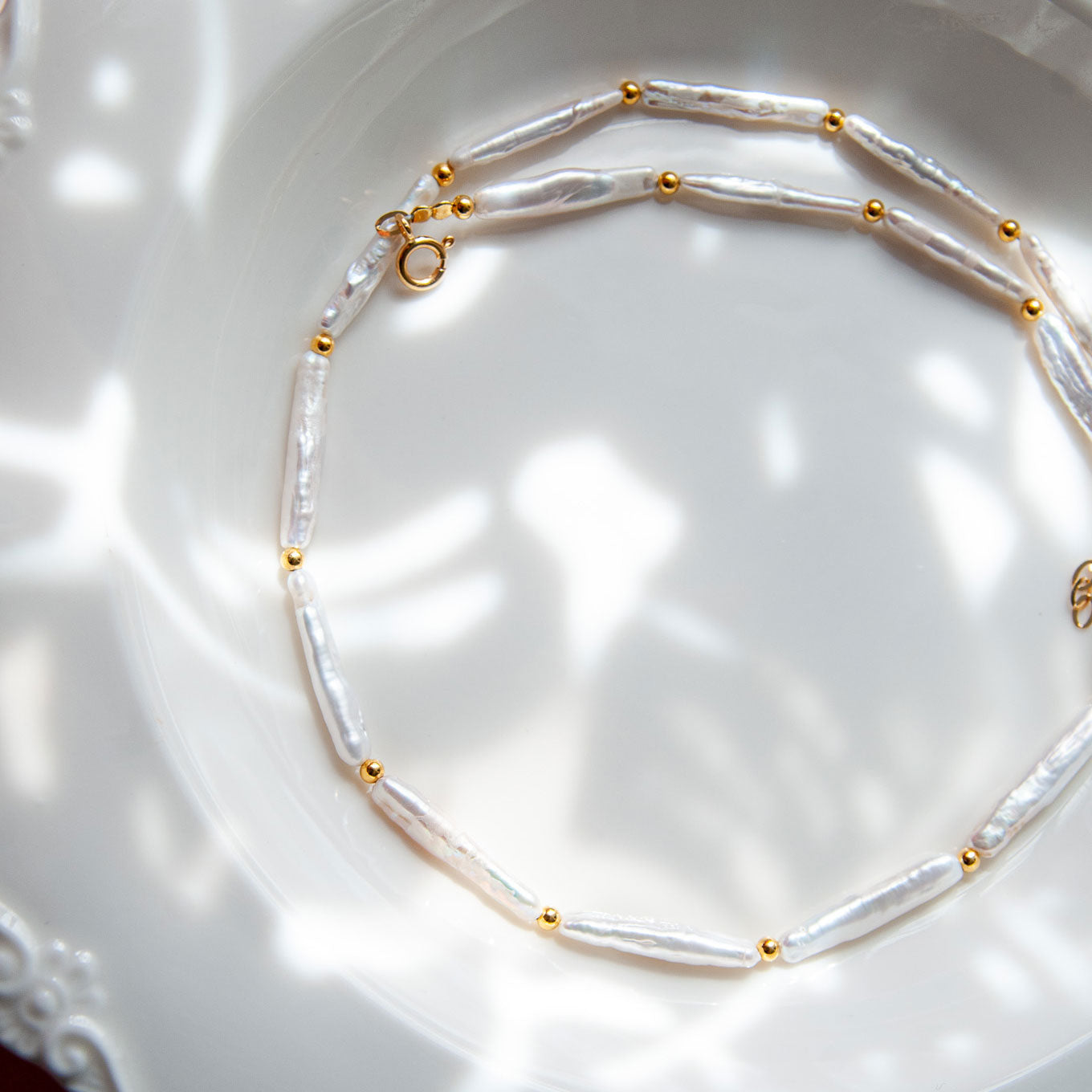 שרשרת צמודה ואלגנטית, עשויה מפניני מים מתוקים טבעיות בשילוב כדורי כסף/גולדפילד עדינים. הפנינים המוארכות והשטוחות שומרות על מראה ייחודי, עם פגמים טבעיים שמדגישים את היופי האותנטי של כל פנינה.