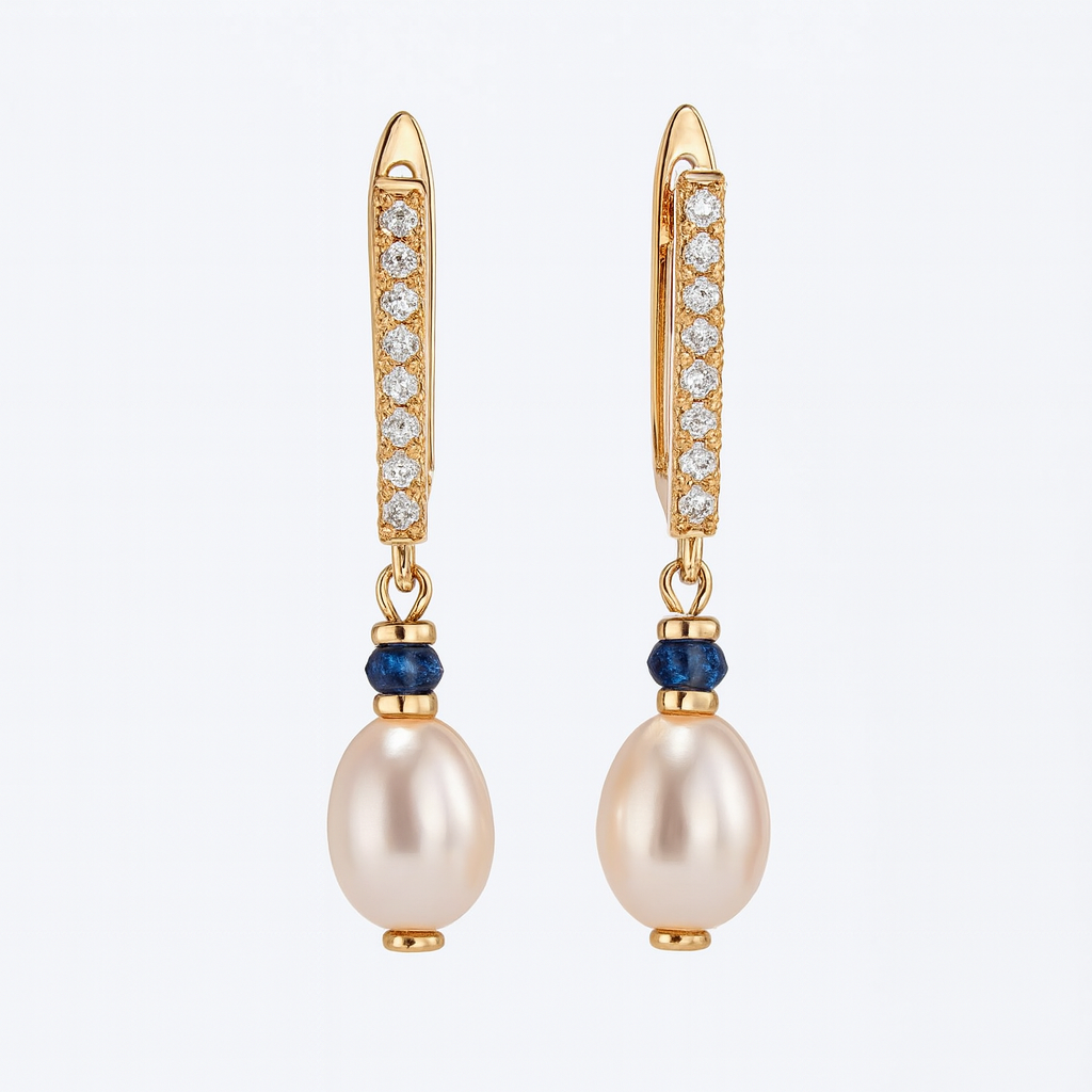 עגילים בעבודת יד, המשלבים פנינת מים מתוקים טבעית יחד עם אבני ספיר כחולות מלאות עומק וזוהר. הסוגר האנגלי הבטיחותי משובץ אבני זרקון נוצצות, בציפוי זהב – להגנה מקסימלית וברק יוקרתי לאורך זמן.