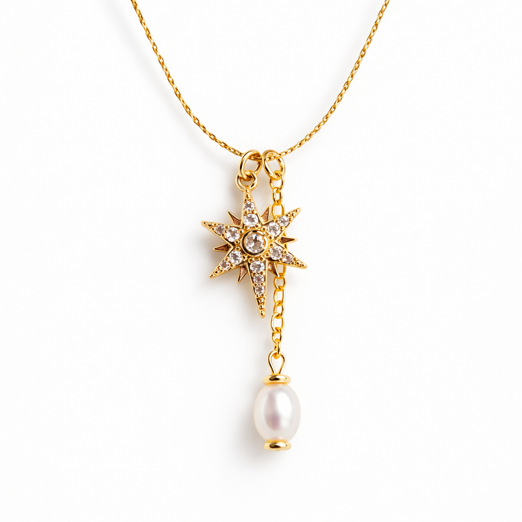שרשרת גולדפילד עדינה ואלגנטית, עם תליון פנינה קלאסית בשילוב כוכב משובץ אבני זרקון מנצנצות. עיצוב נשי ומלא אור, שמשלב בין רוך טבעי לנוכחות זוהרת.
