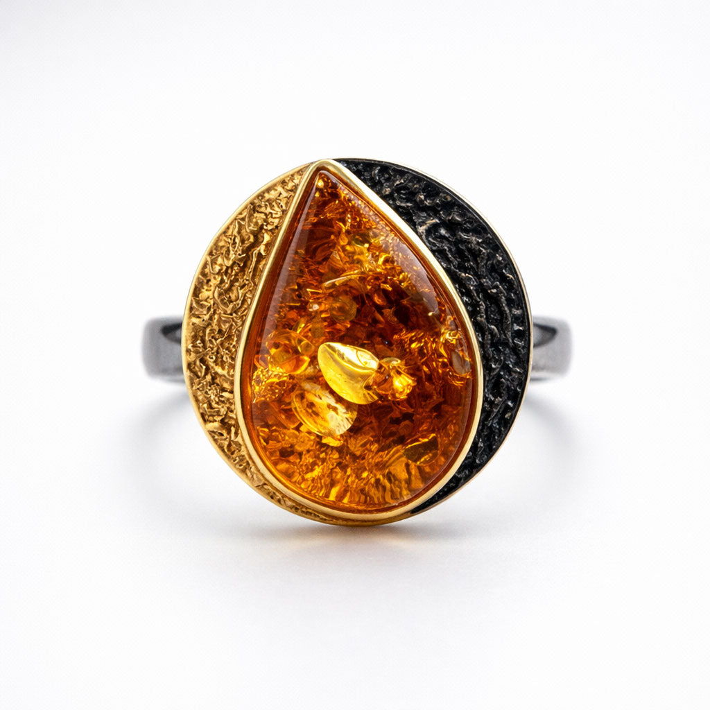 במרכז הטבעת משובץ ענבר בלטי טבעי בגוון קוניאק, בעל עומק וברק טבעי המעניקים לתכשיט נוכחות אלגנטית ויוקרתית.
