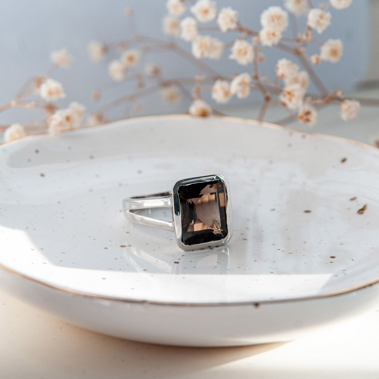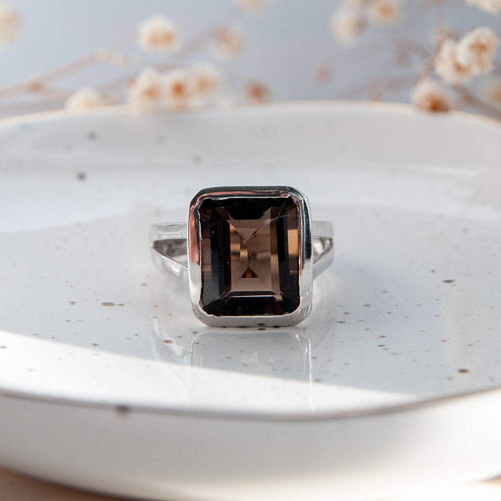 במרכז הטבעת משובצת אבן סמוקי קוורץ טבעית בגוון חום עמוק ומעודן, המעניק לה מראה יוקרתי וקסם אלגנטי שמתאים לכל סגנון לבוש.