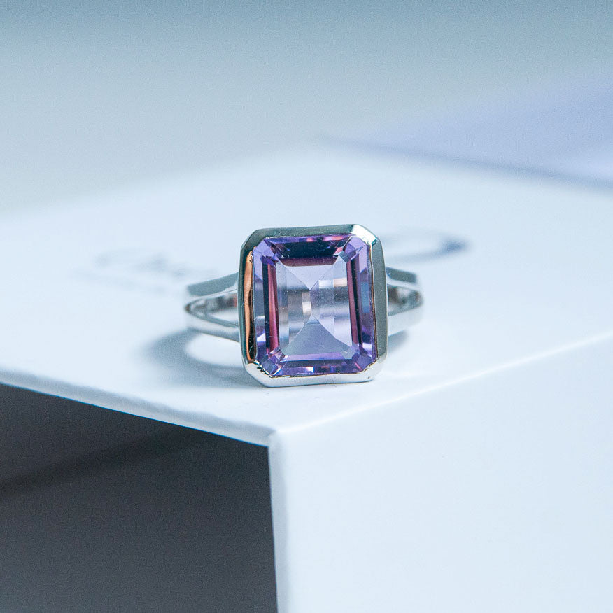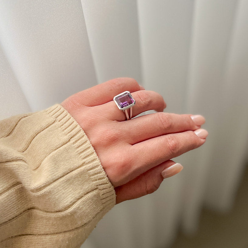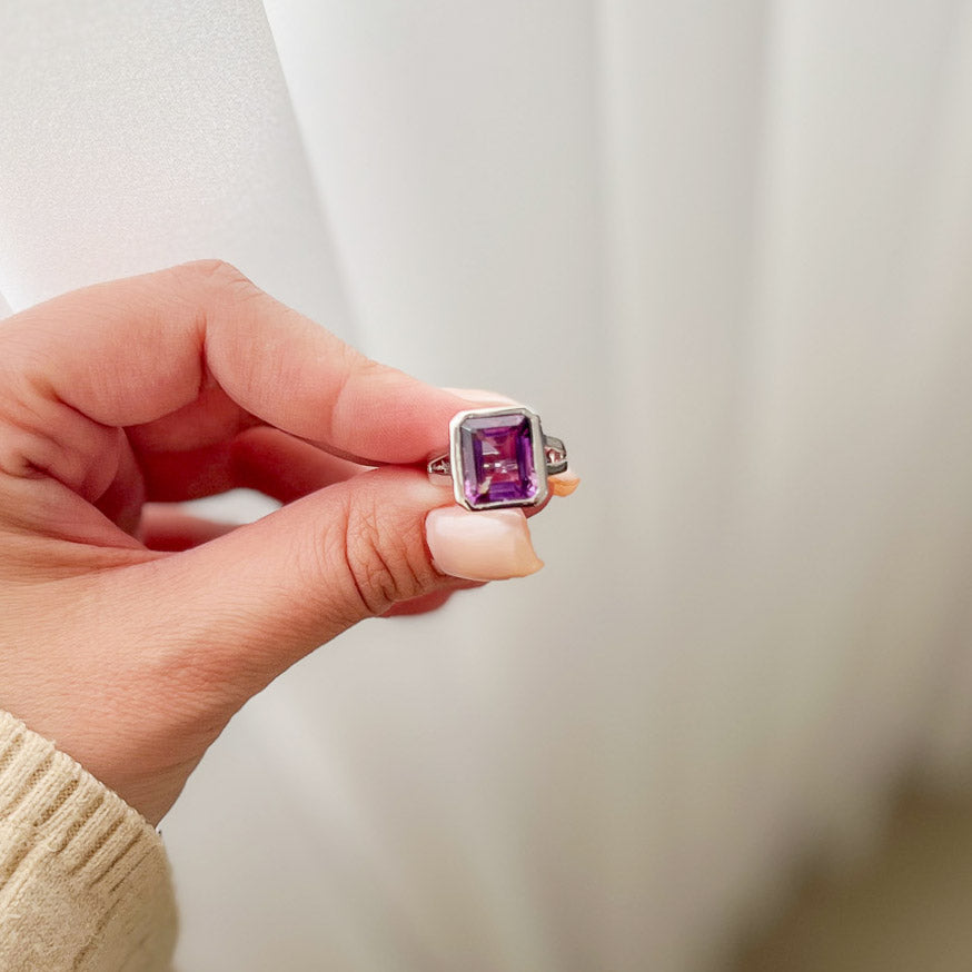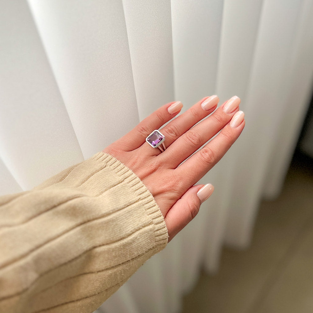 במרכז הטבעת משובצת אבן אמטיסט טבעית בגוון סגלגל עמוק ומלא אור, המשדרת רוגע, איזון ואלגנטיות נצחית.