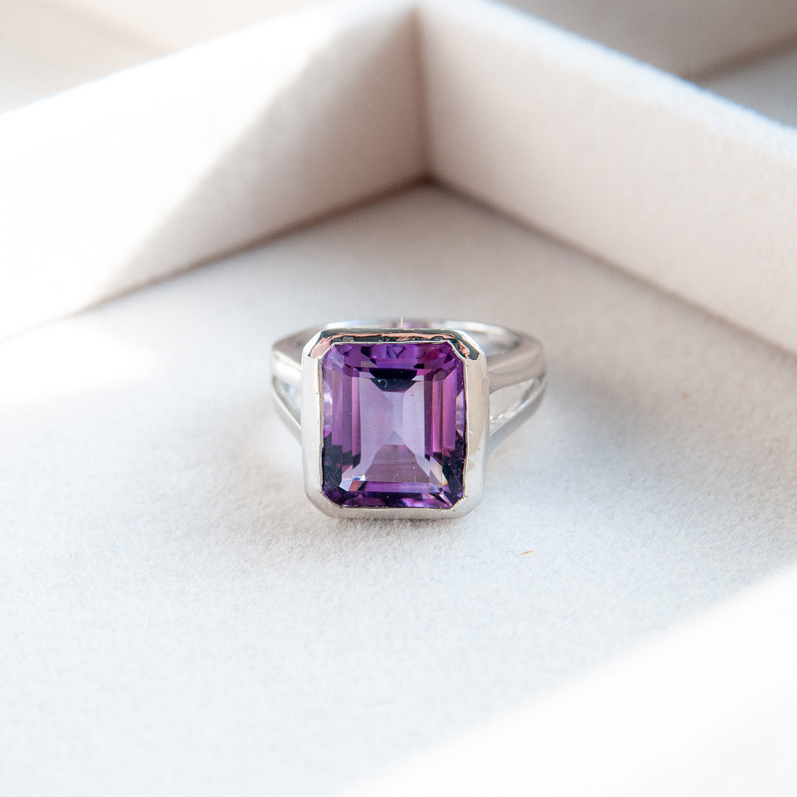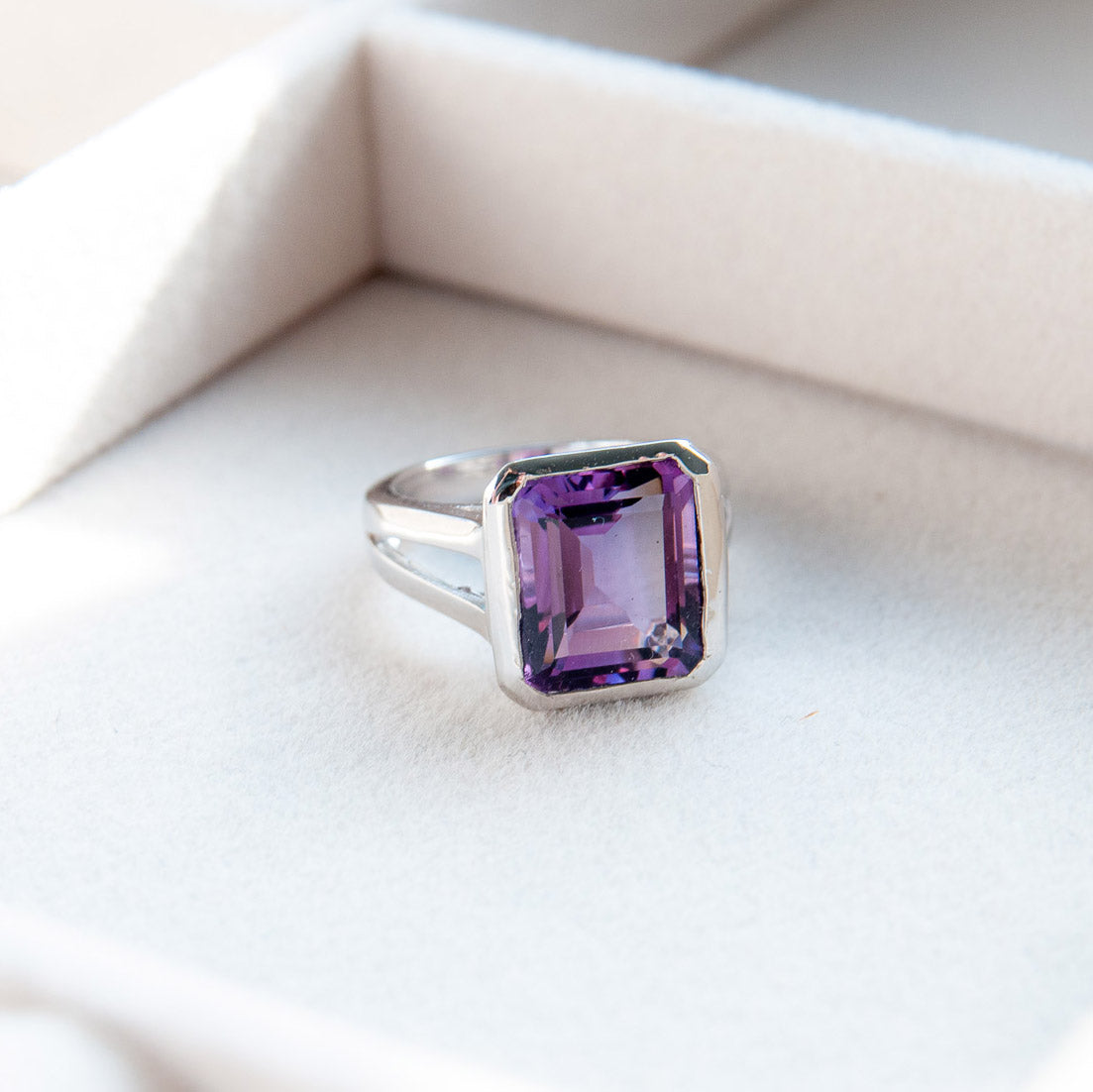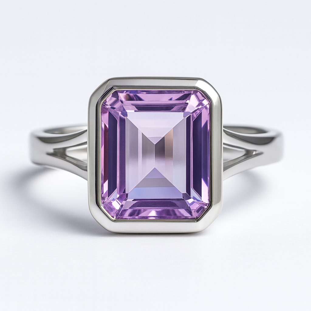 במרכז הטבעת משובצת אבן אמטיסט טבעית בגוון סגלגל עמוק ומלא אור, המשדרת רוגע, איזון ואלגנטיות נצחית.