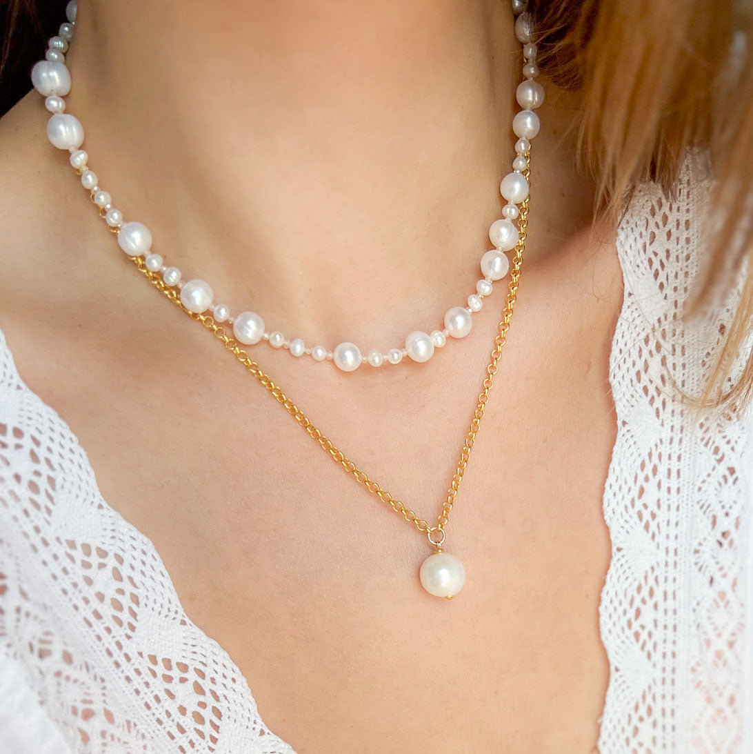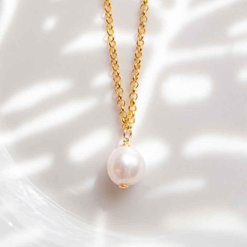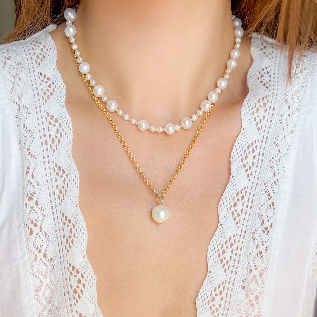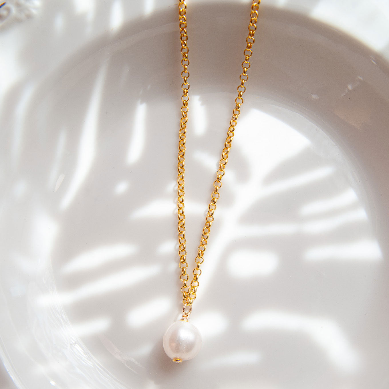 שרשרת אלגנטית ומרשימה עשויה מכסף טהור 925 בציפוי זהב איכותי, השומר על הברק והיופי לאורך זמן. במרכז השרשרת משובצת פנינה לבנה טבעית וגדולה (בגודל כ-10/11 מ"מ), המושכת את העין בעדינותה ומוסיפה מראה יוקרתי וקלאסי לכל סגנון לבוש.
