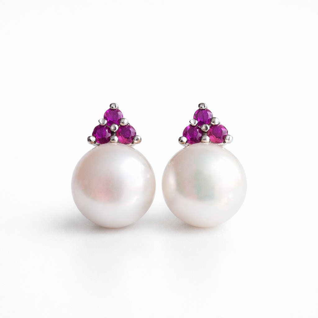 במרכז כל עגיל שוכנת פנינה טבעית לבנה, בעלת ברק עדין ונקי – סמל לנשיות, טוהר והרמוניה פנימית. מעל הפנינה שובצו 3 אבני רובי טבעיות בגוון אדום עמוק, שמוסיפות נגיעה של עוצמה, חום ויוקרה.