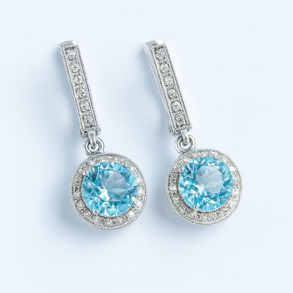 העגילים משובצים באבני בלו טופז טבעיות זוהרות ובאבני זרקון שקופות לניצוץ ייחודי.