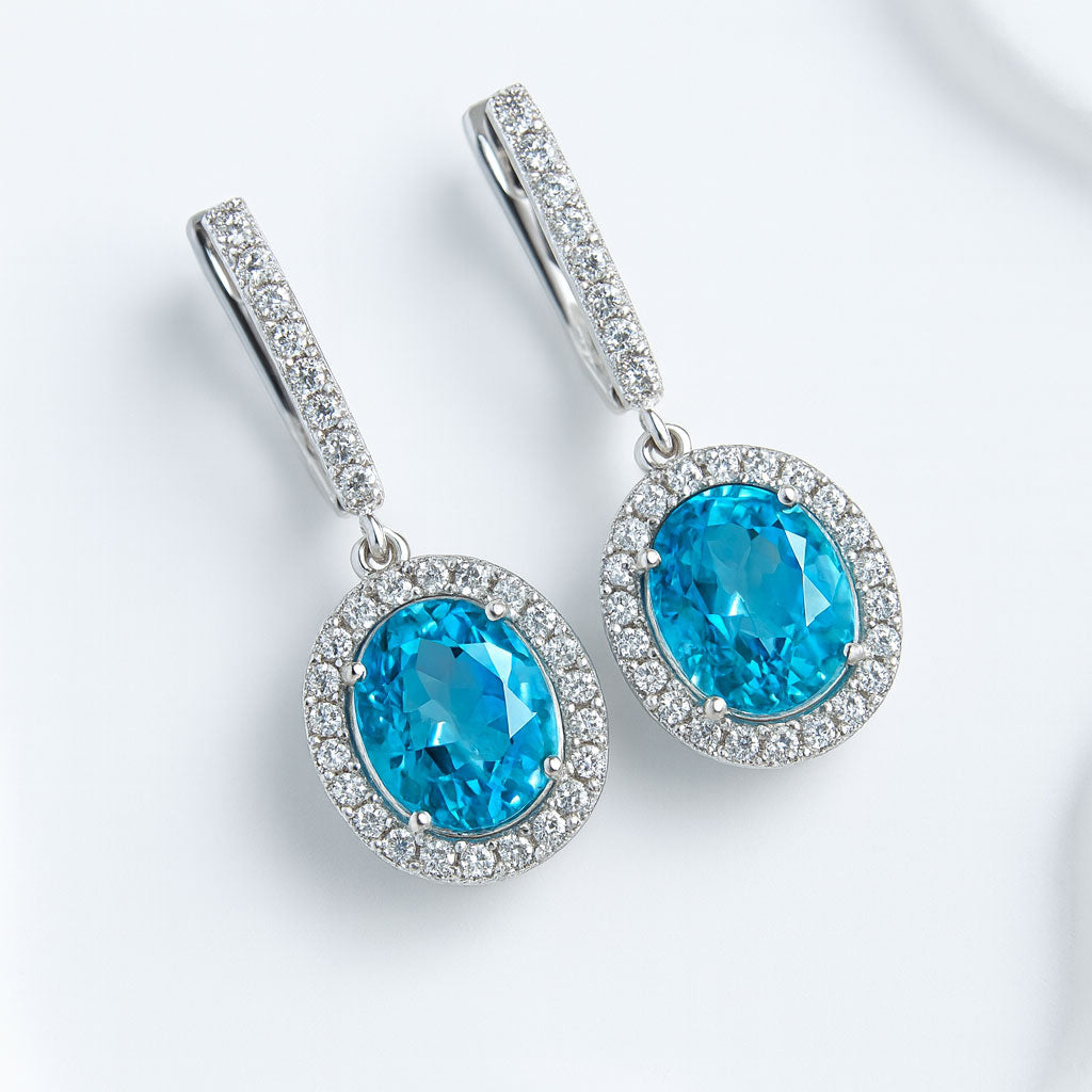 העגילים משובצים באבני בלו טופז טבעיות בגוון כחול קסום ובאבני זרקון שקופות שמעניקות להם ניצוץ עדין וזוהר.
